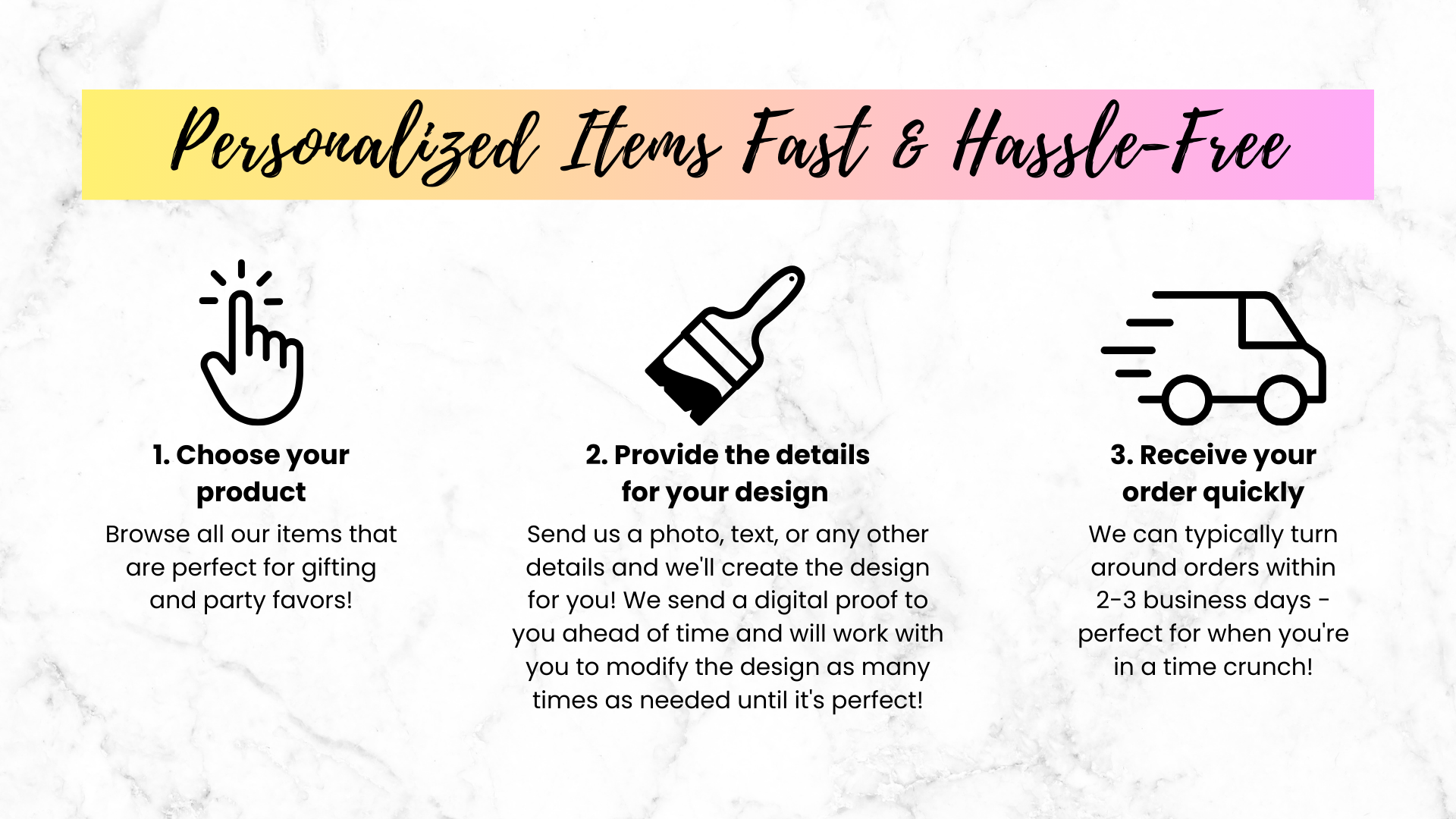 We can accommodate last-minute rush orders with quick turnaround times and local delivery options to ensure they get delivered on time. Just send us your design or even just an idea of what you need and we'll gladly help you bring it to life! Let’s make your occasion unforgettable!