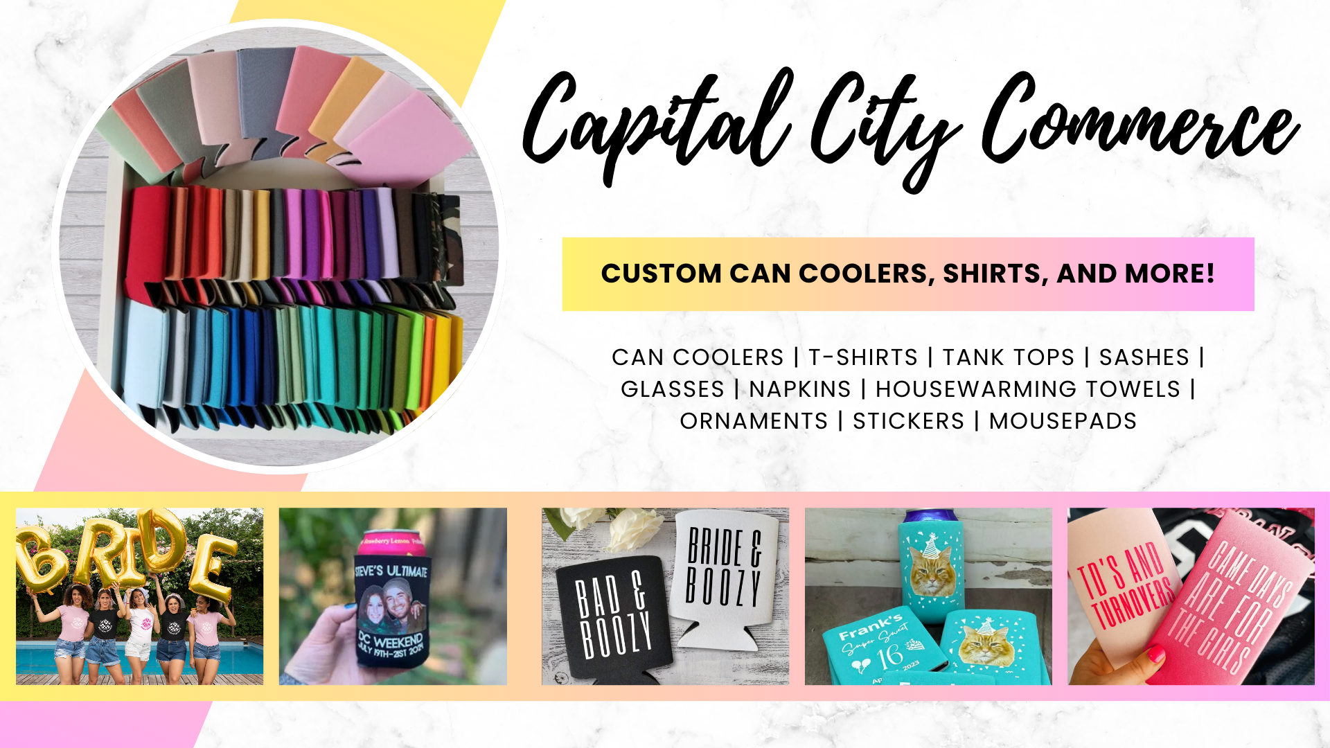 Hi, welcome to Capital City Commerce! We are based in Arlington, VA, just outside of Washington, DC, and we specialize in creating custom apparel, can coolers, and any other accessories you need for your event!