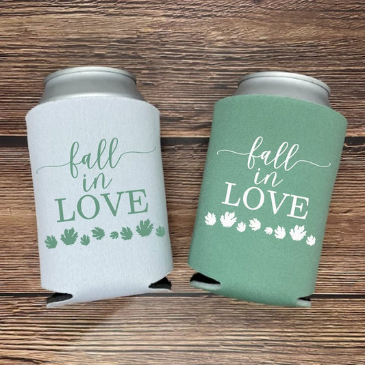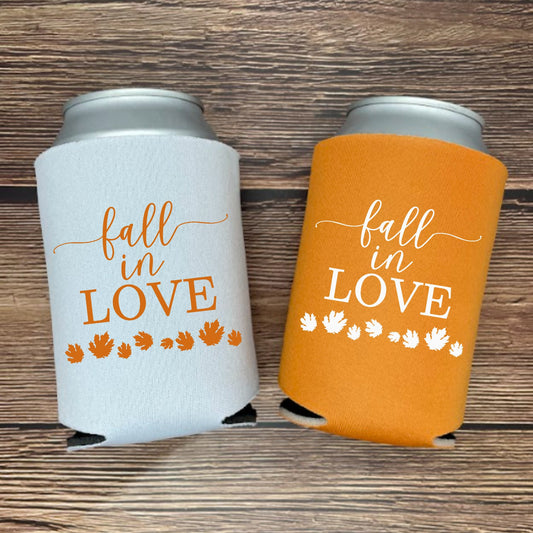 Custom Fall Wedding Can Coolers, Fall In Love Coolies