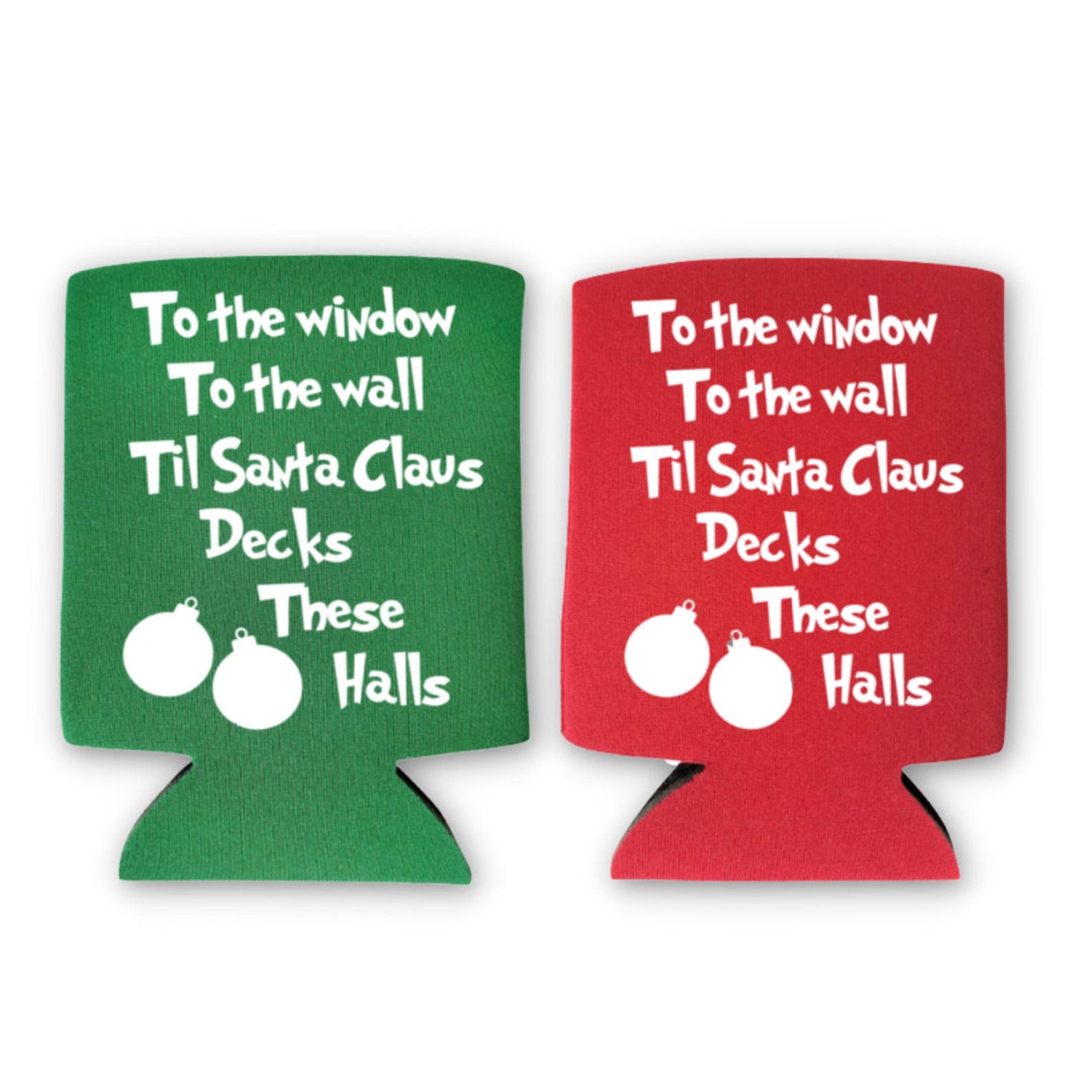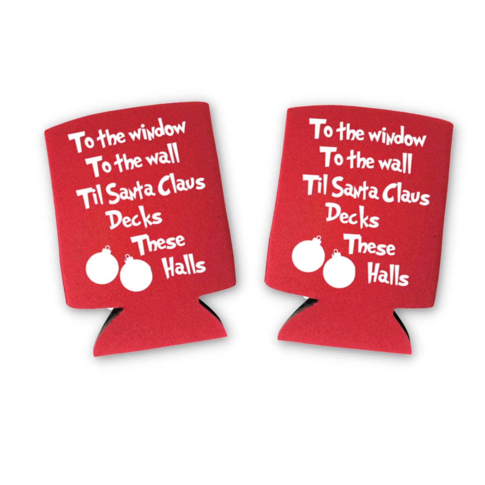 -- "TO THE WINDOW TO THE WALL TIL SANTA CLAUS DECKS THESE HALLS" CAN COOLERS - Show your festive side and provide these beer can coolers as a gift for your guests to keep their drinks cold. You’ll be the hit of the party with these hilarious holiday drink holders. Everyone will want one at your gathering!