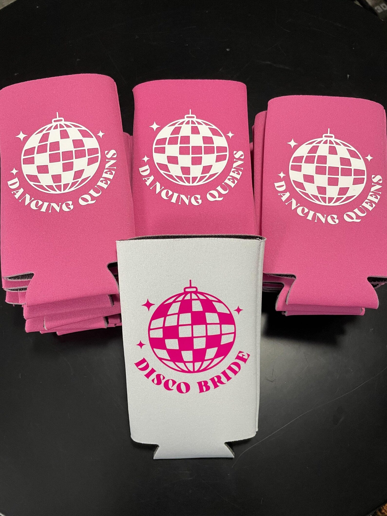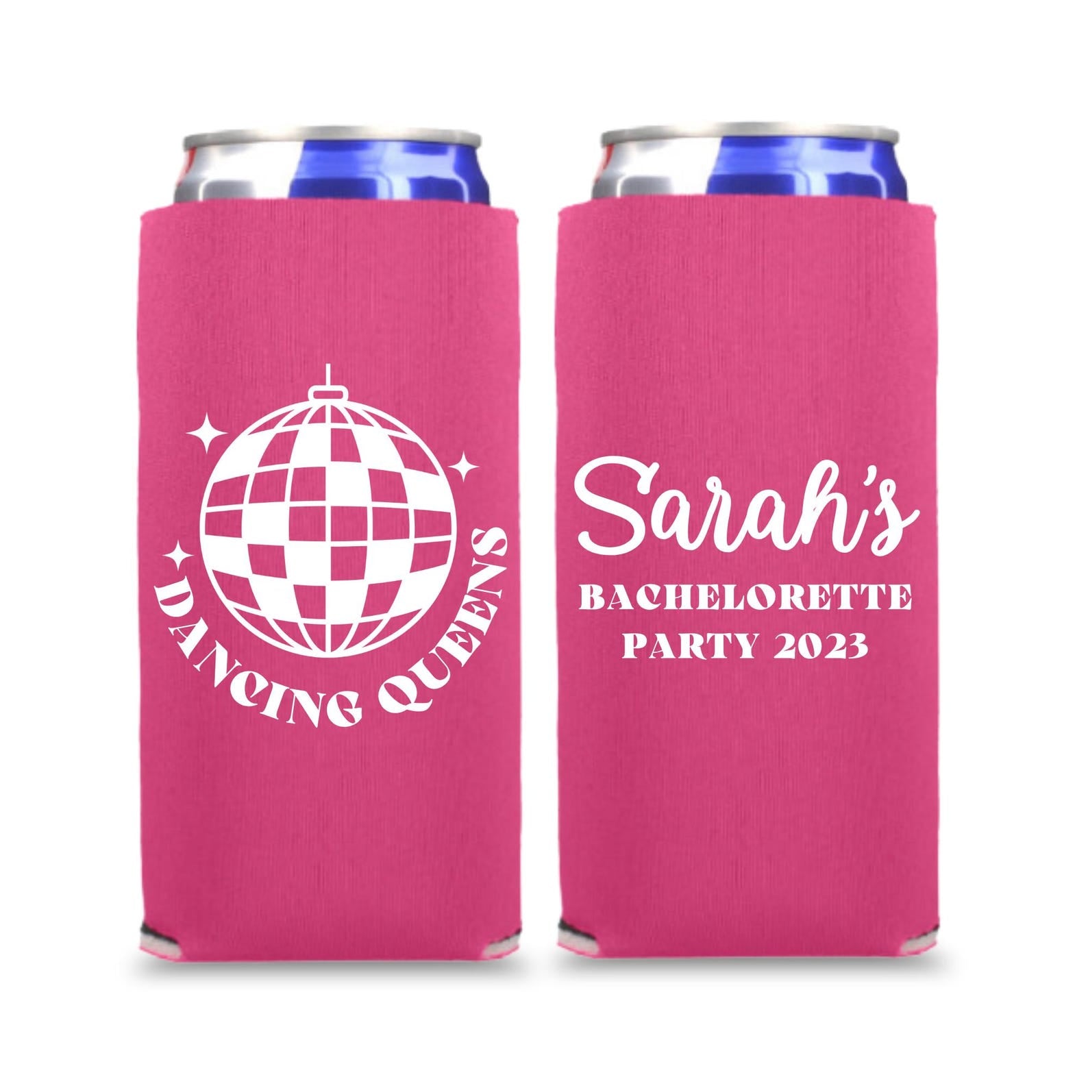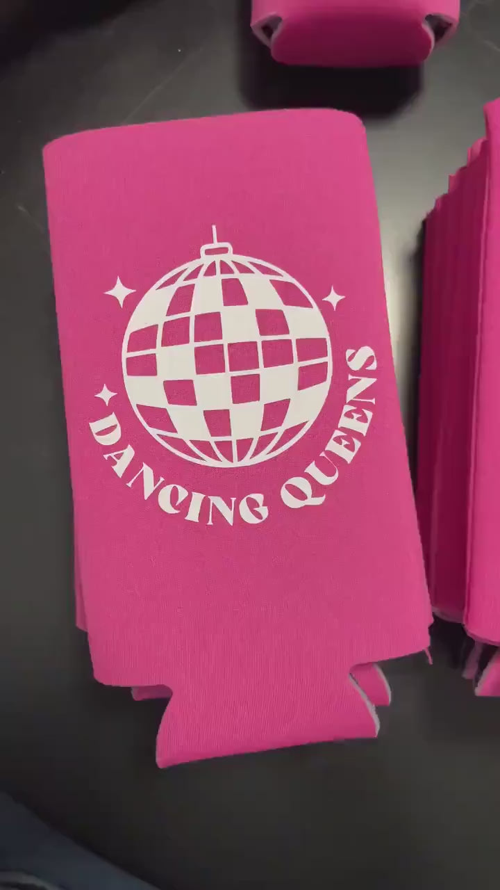These "Disco Bride and Dancing Queens" slim coolers are the perfect alcohol accessory for your bachelorette party, engagement party, or any other occasion! These slim coolies make a great gift for your wedding party, family members, friends, and wedding guests!