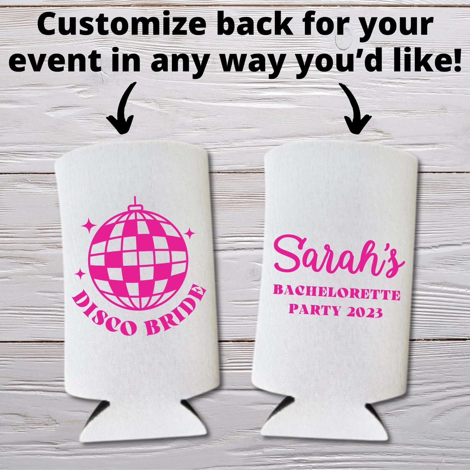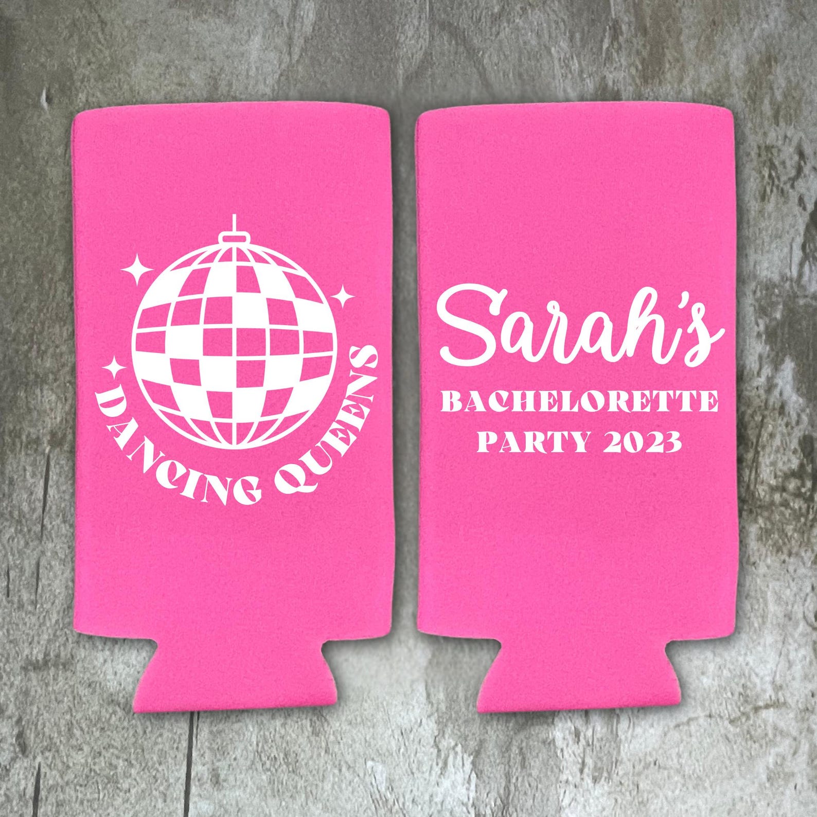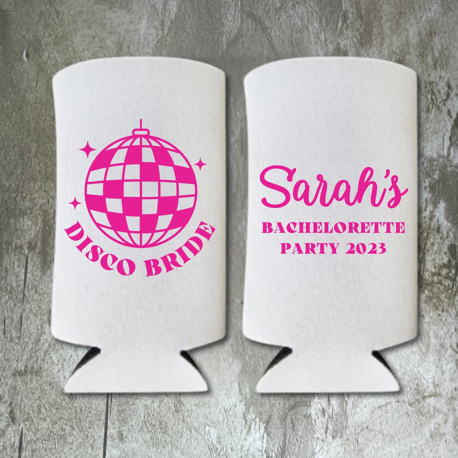These "Disco Bride and Dancing Queens" slim coolers are the perfect alcohol accessory for your bachelorette party, engagement party, or any other occasion! These slim coolies make a great gift for your wedding party, family members, friends, and wedding guests!