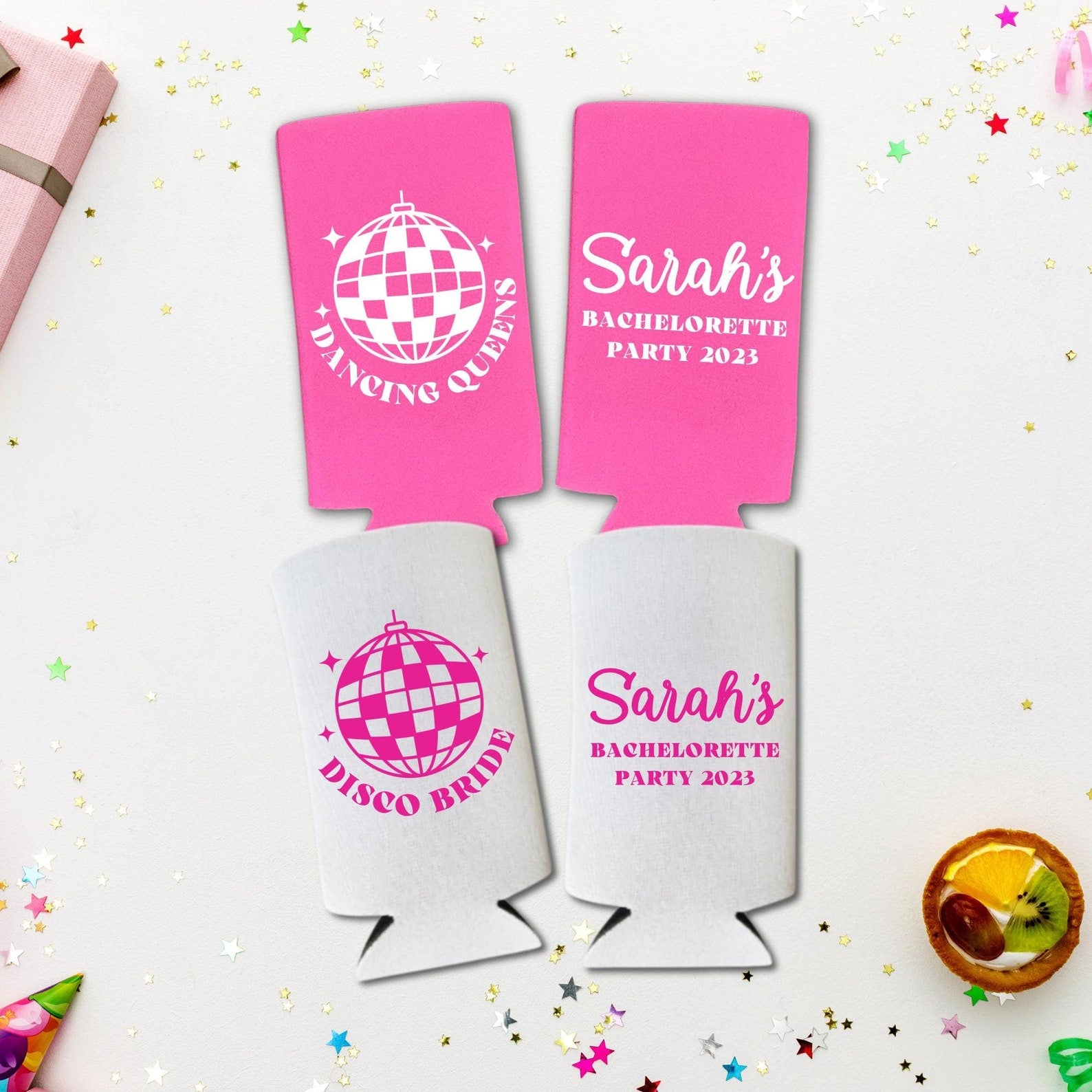 -- "DISCO BRIDE, DANCING QUEENS" SPIKED SELTZER COOLERS - These slim coolers are exactly what you've been looking for to keep your spiked seltzer cold in style during the bachelorette party or any other occasion!