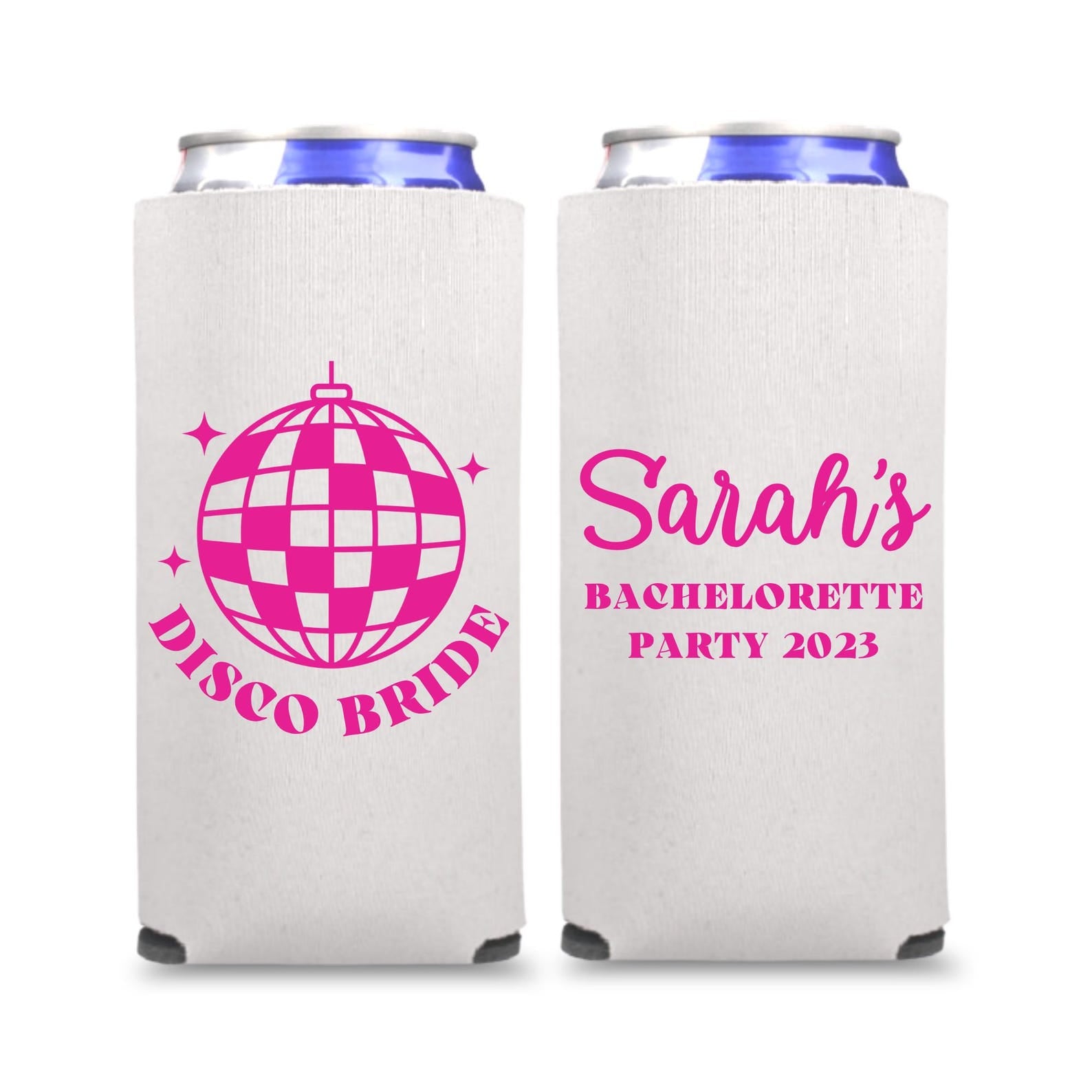 Custom Bachelorette Spiked Seltzer Coolers, Disco Bride and Dancing Queens Skinny Coolers