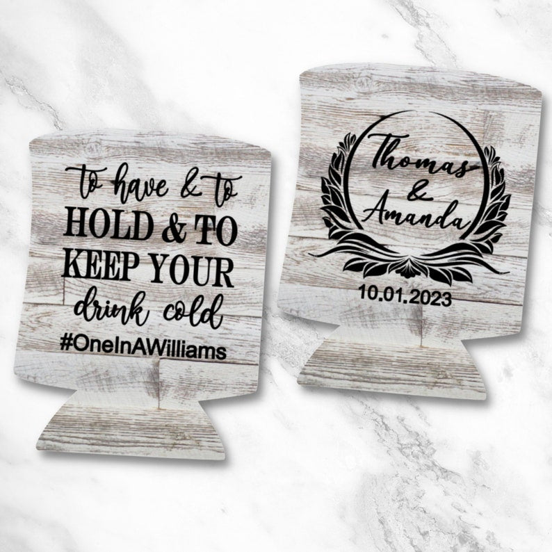 Custom Light Barnwood Can Coolers, Shiplap Personalized Wedding Coolies