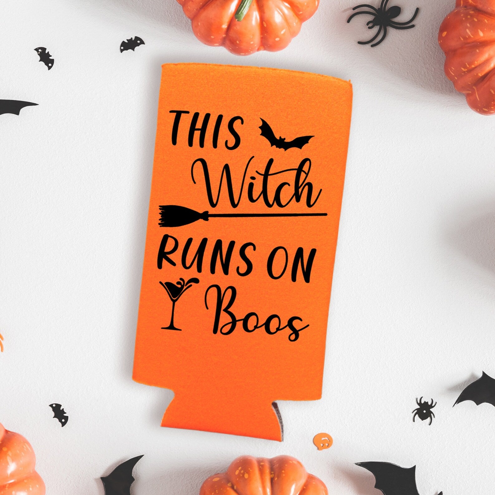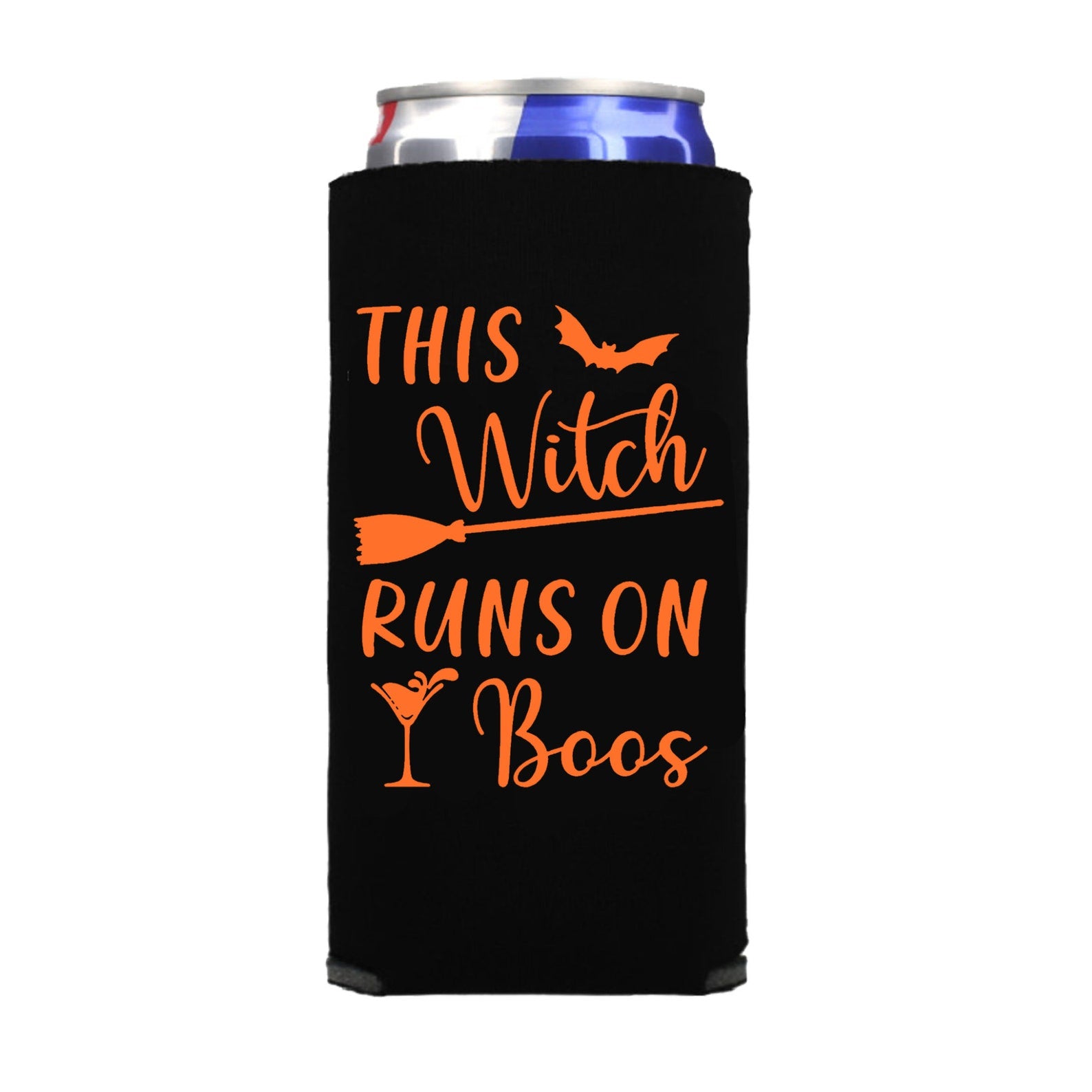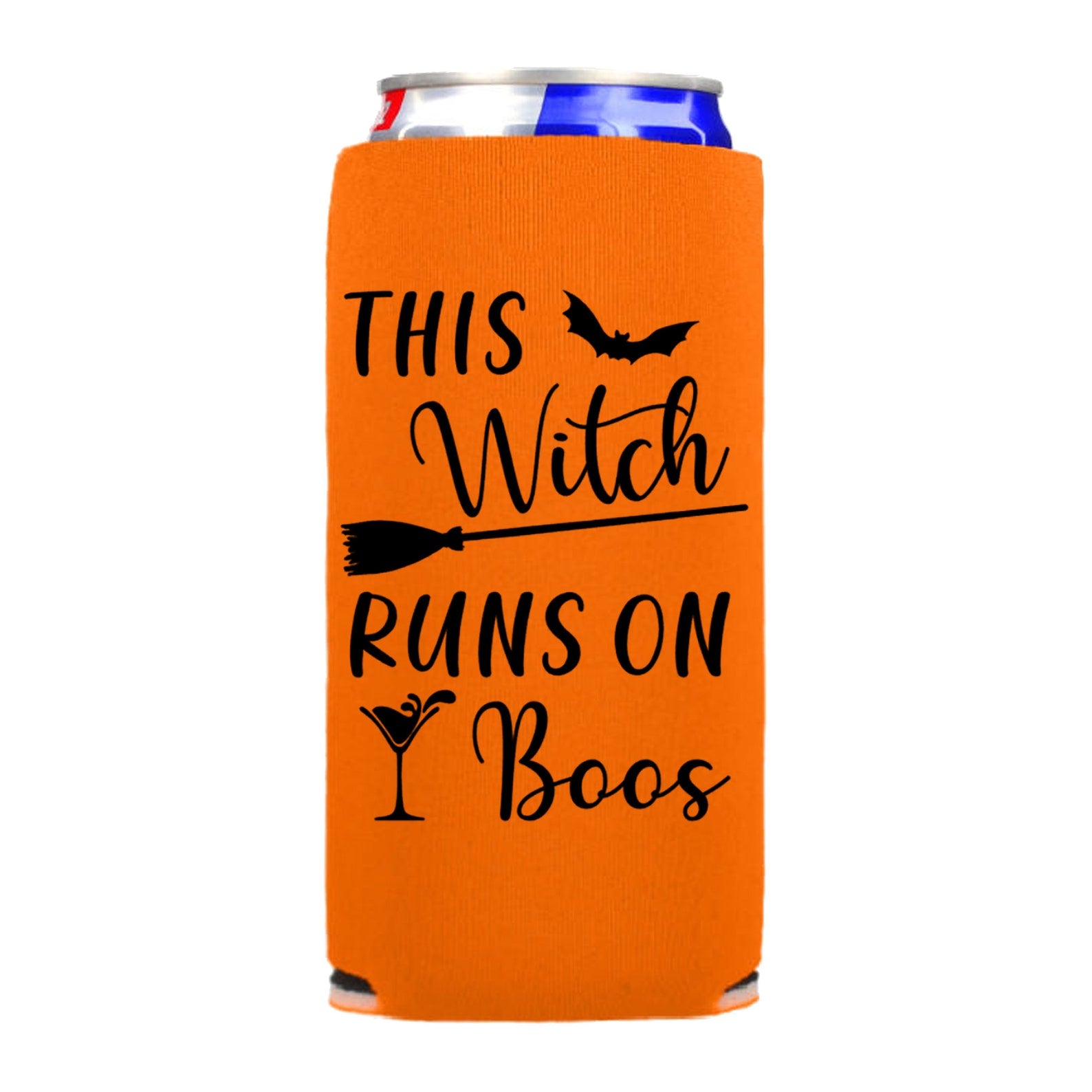 -- FUNNY HALLOWEEN SLIM CAN COOLER - The designs are printed on both sides, prominently featuring the words "This Witch Runs on Boos" as pictured.
