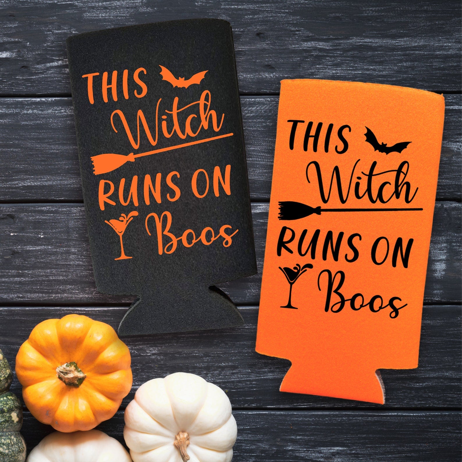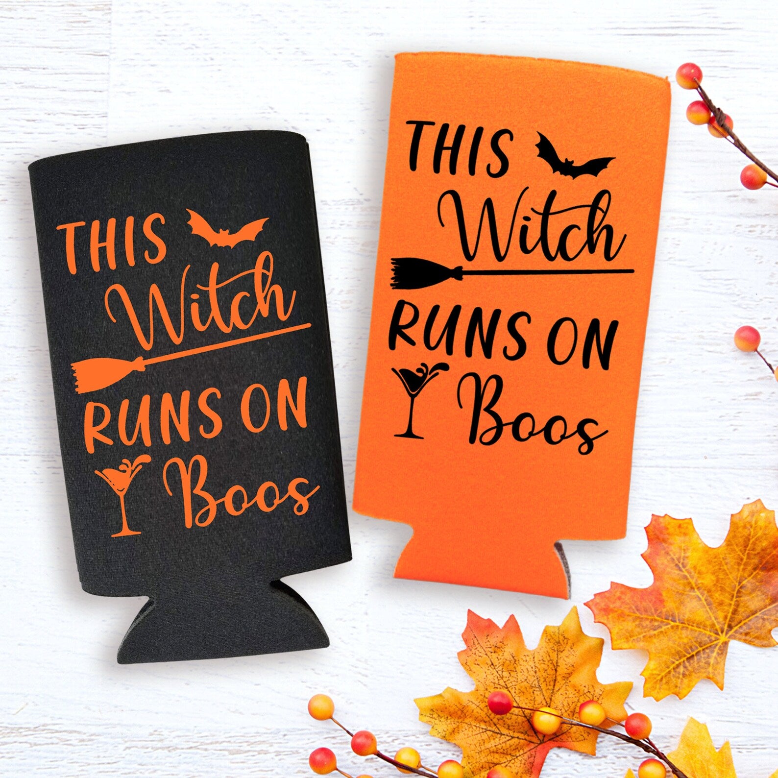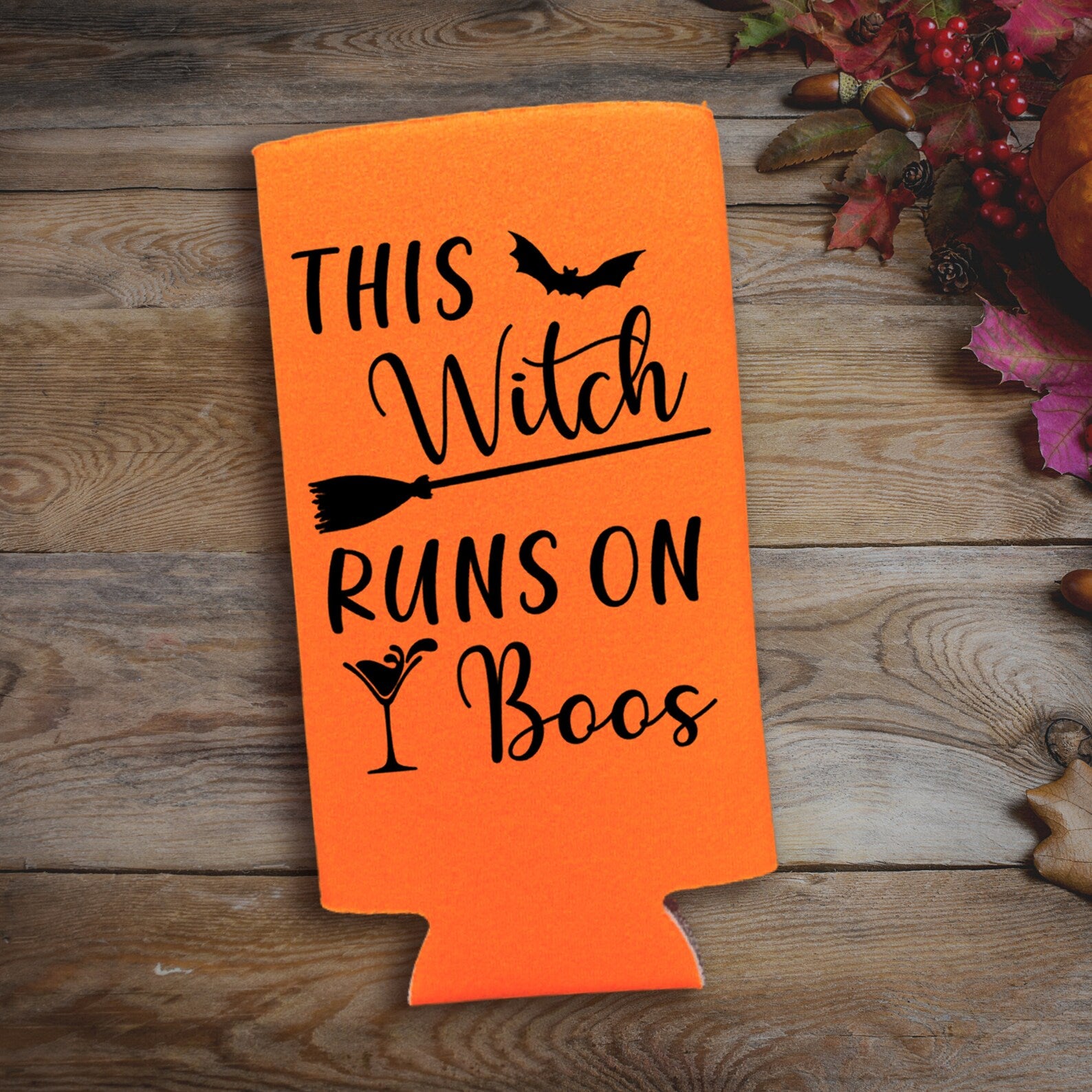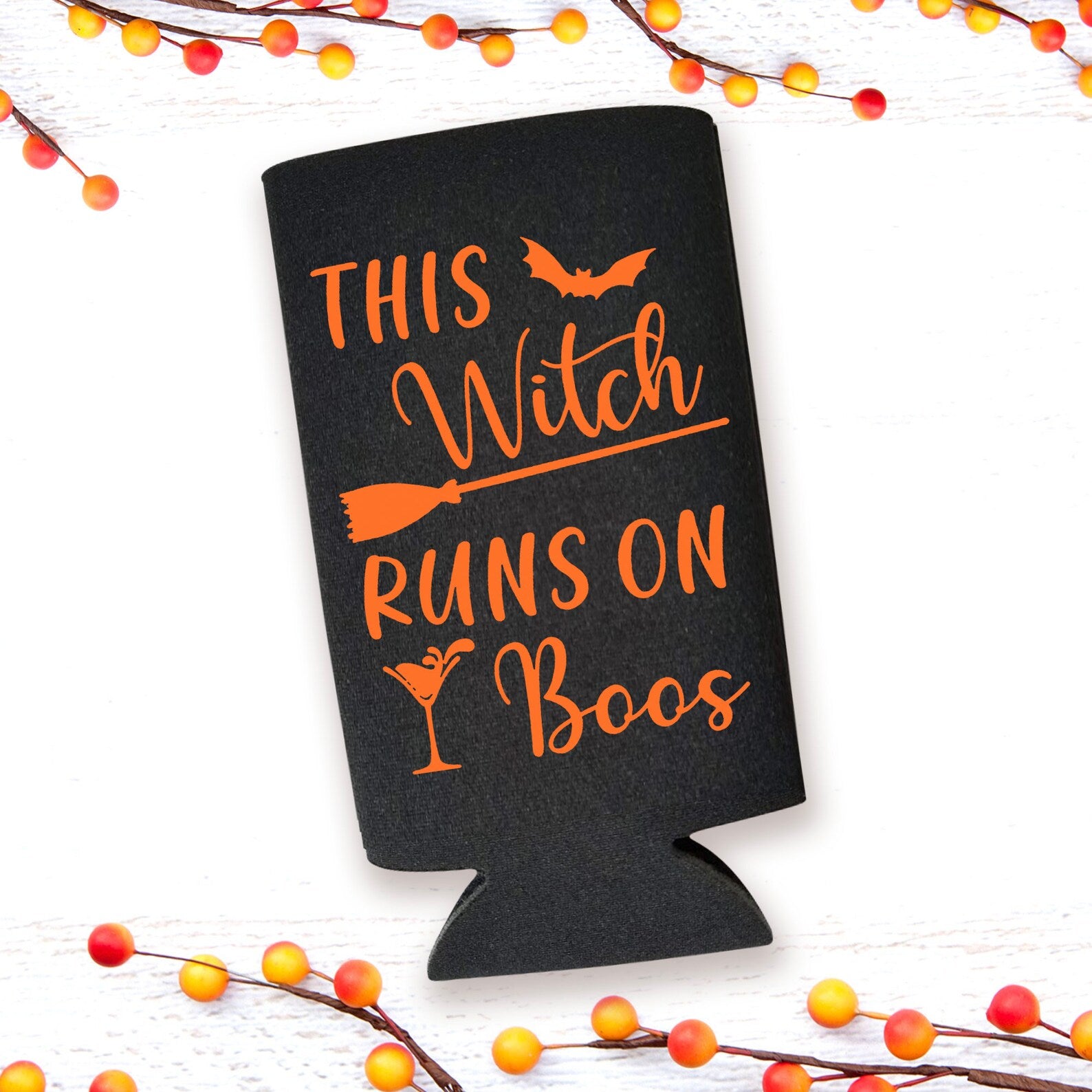 -- FUNNY HALLOWEEN SLIM CAN COOLER - The designs are printed on both sides, prominently featuring the words "This Witch Runs on Boos" as pictured.
